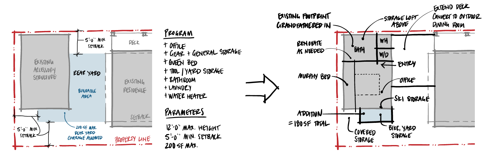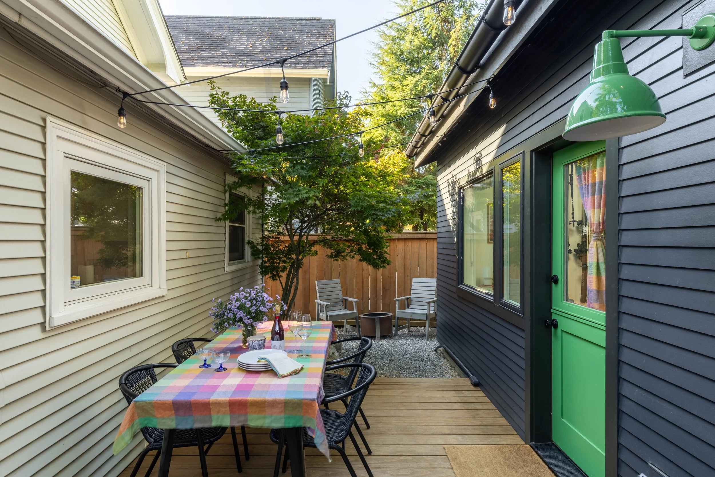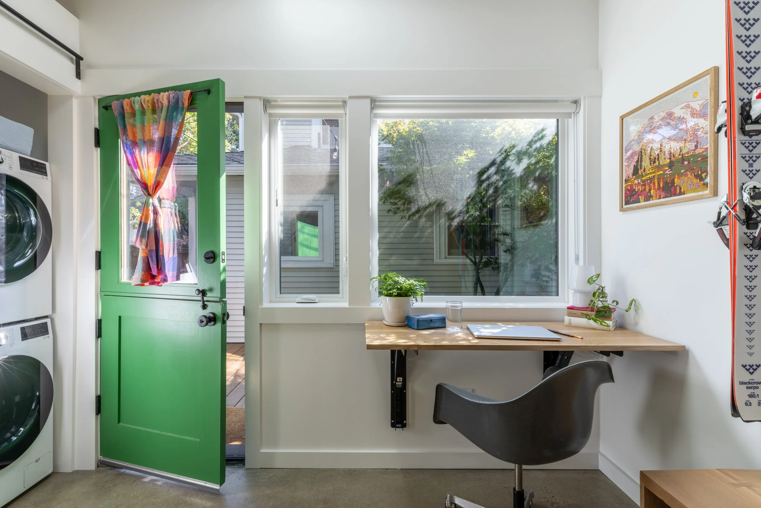 After fixing up their West Seattle farmhouse originally constructed in 1908, the owners set their sights on the garden shed out back—especially because it already had its own plumbing. Aiming to bring “the outhouse” into modern functionality, what resulted was an efficient yet cozy guesthouse with smart storage solutions equipped with a work from home space. The ideal space to hold all the gear of these avid outdoor enthusiasts between adventures, while holding space for their many friends and family who come to stay (all in 180 square feet).