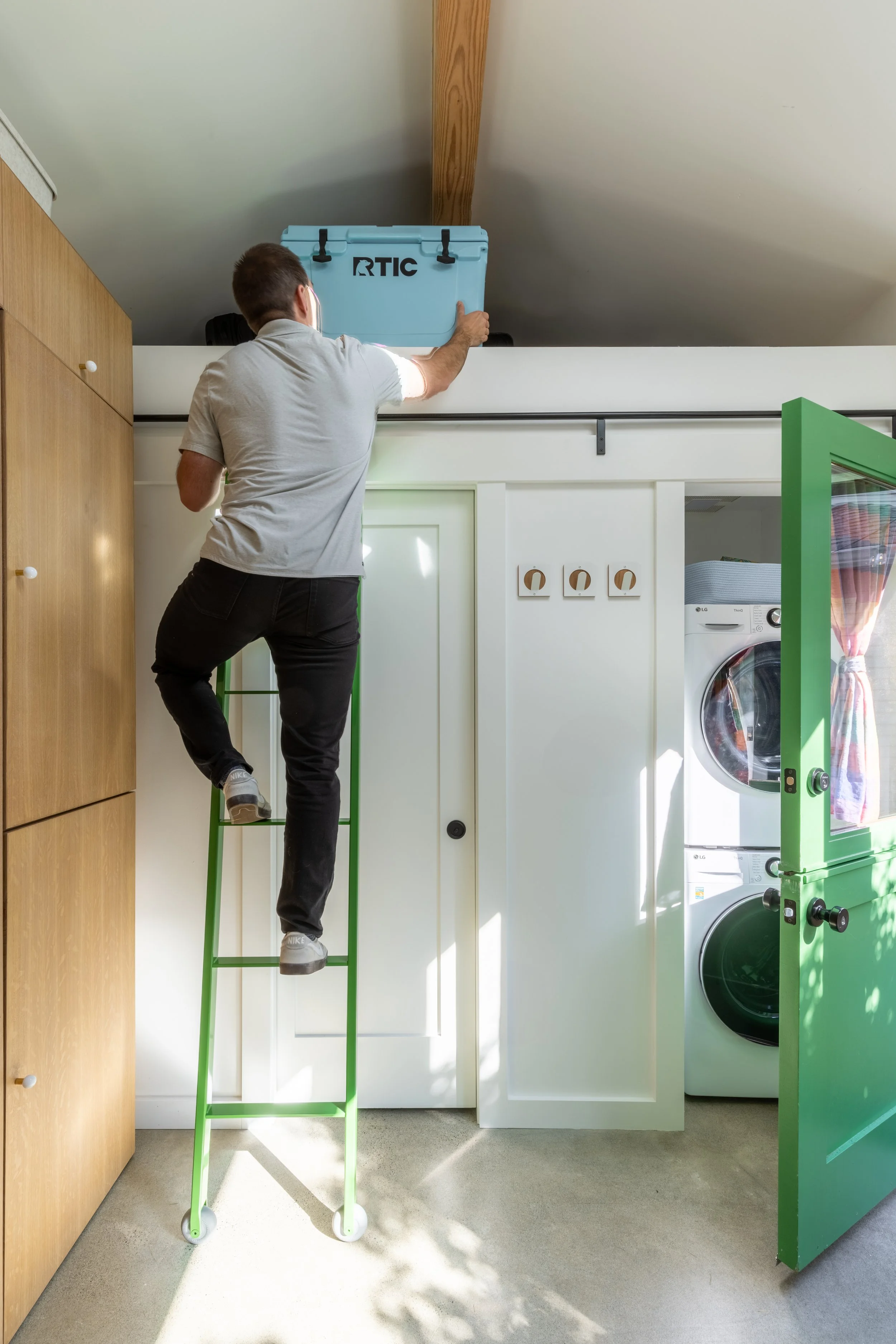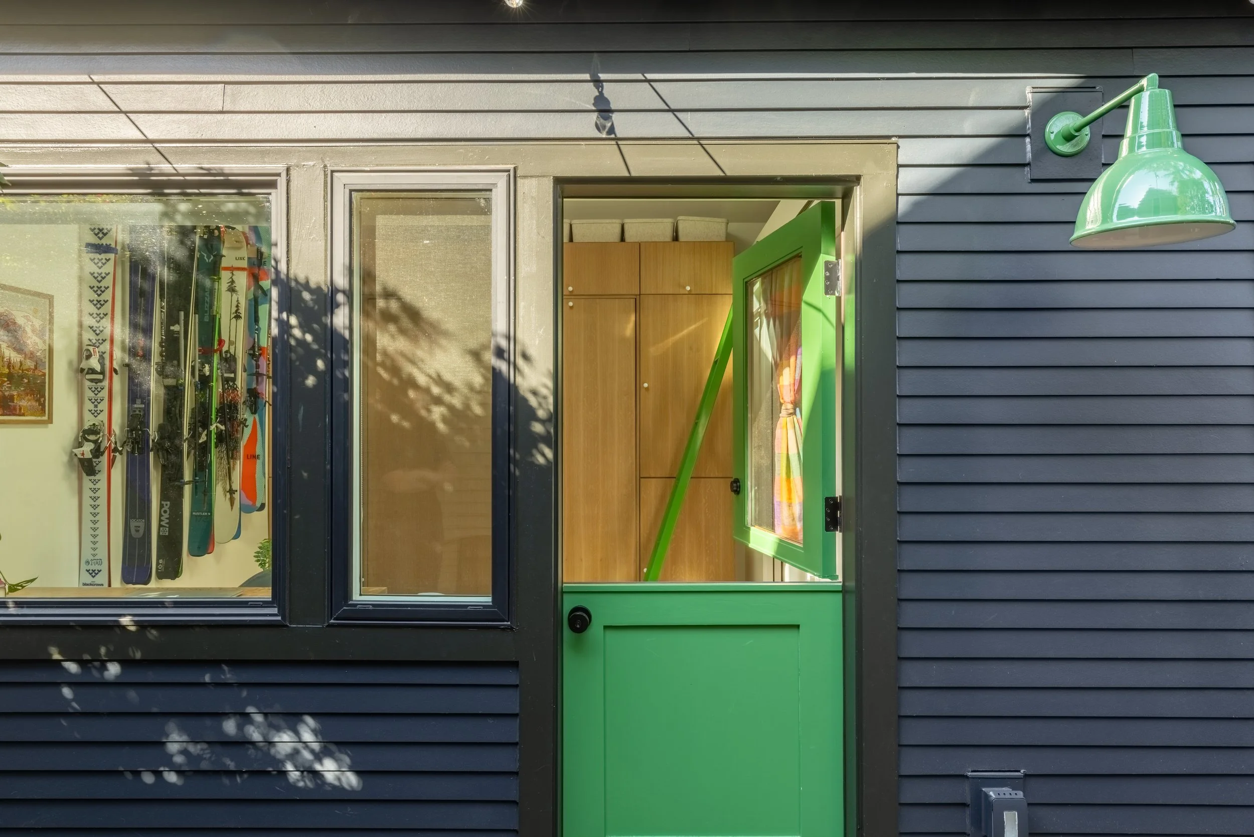 The material choices were an intentional departure from the farmhouse style of the primary house, with classic ski chalets of Scandinavia and Northern Italy serving as clear inspiration for the space in form, feel, and functionality. Minimalism and simple materials with great intention bring brightness, and a cozy cleanliness with white walls against white oak casework; white and blue tiles next to a sleek white concrete sink. With big pops of kelly green on the front Dutch door, sliding ladder, and exterior wall sconce inviting you in.