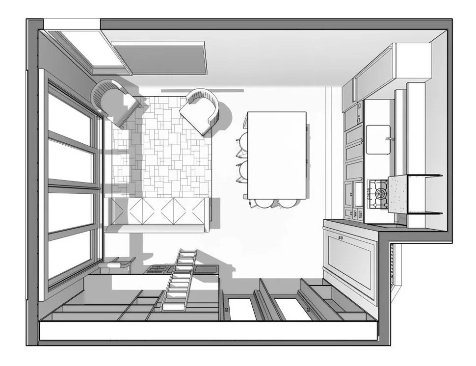 The design of this Accessory Dwelling Unit started with a simple charge: create a space to take advantage of a water view and provide a comfortable place for guests or even the owners themselves to one day live. With that in mind we took advantage of the existing garage and created a one-bedroom apartment on top with a spacious deck offering views of the Puget sound. A wall of statement shelving showcases the couple's books and objects collected over the years and creates a clear boundary between the public and private areas. A compact kitchen offers all the necessary appliances while a large island provides the perfect place for a casual dinner. A mix of calming blues and wood tones tie it all together to create a tastefully beachy mood.