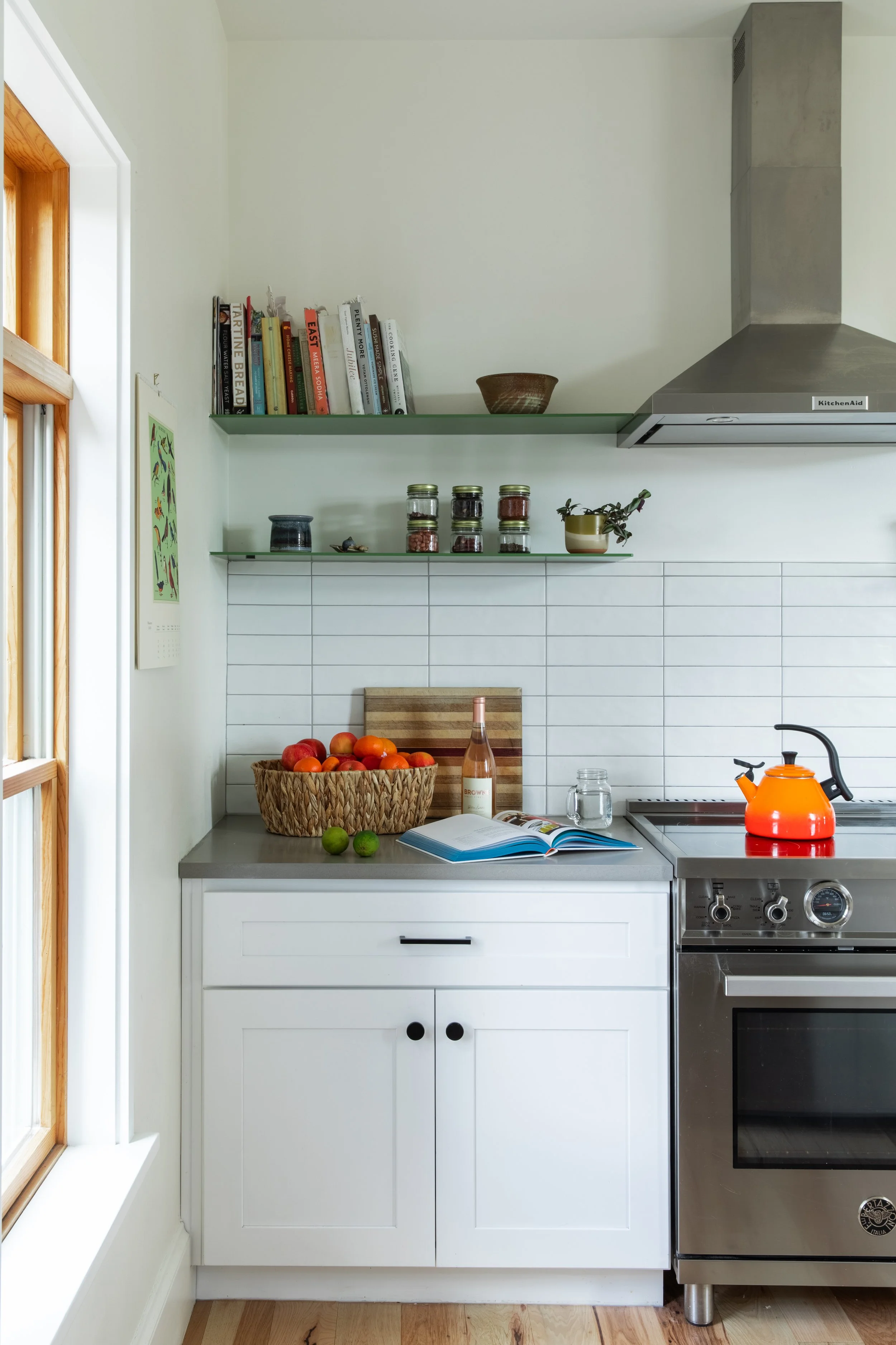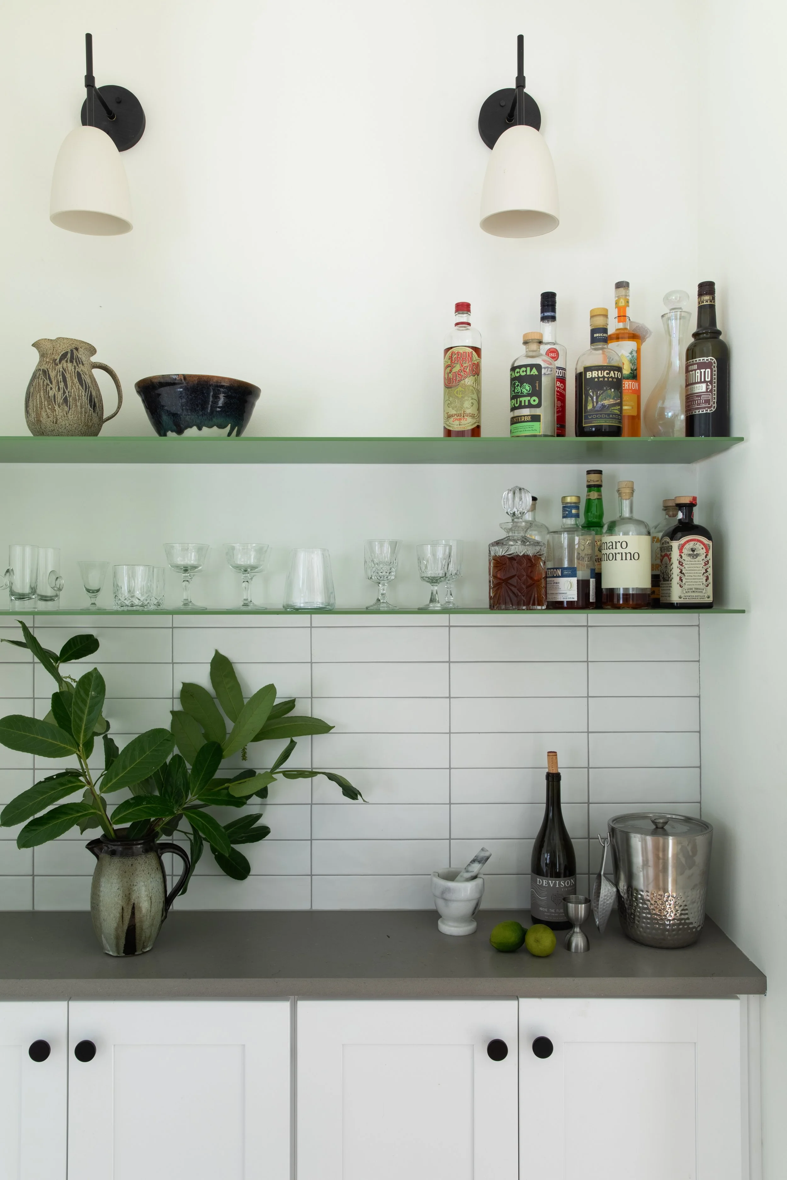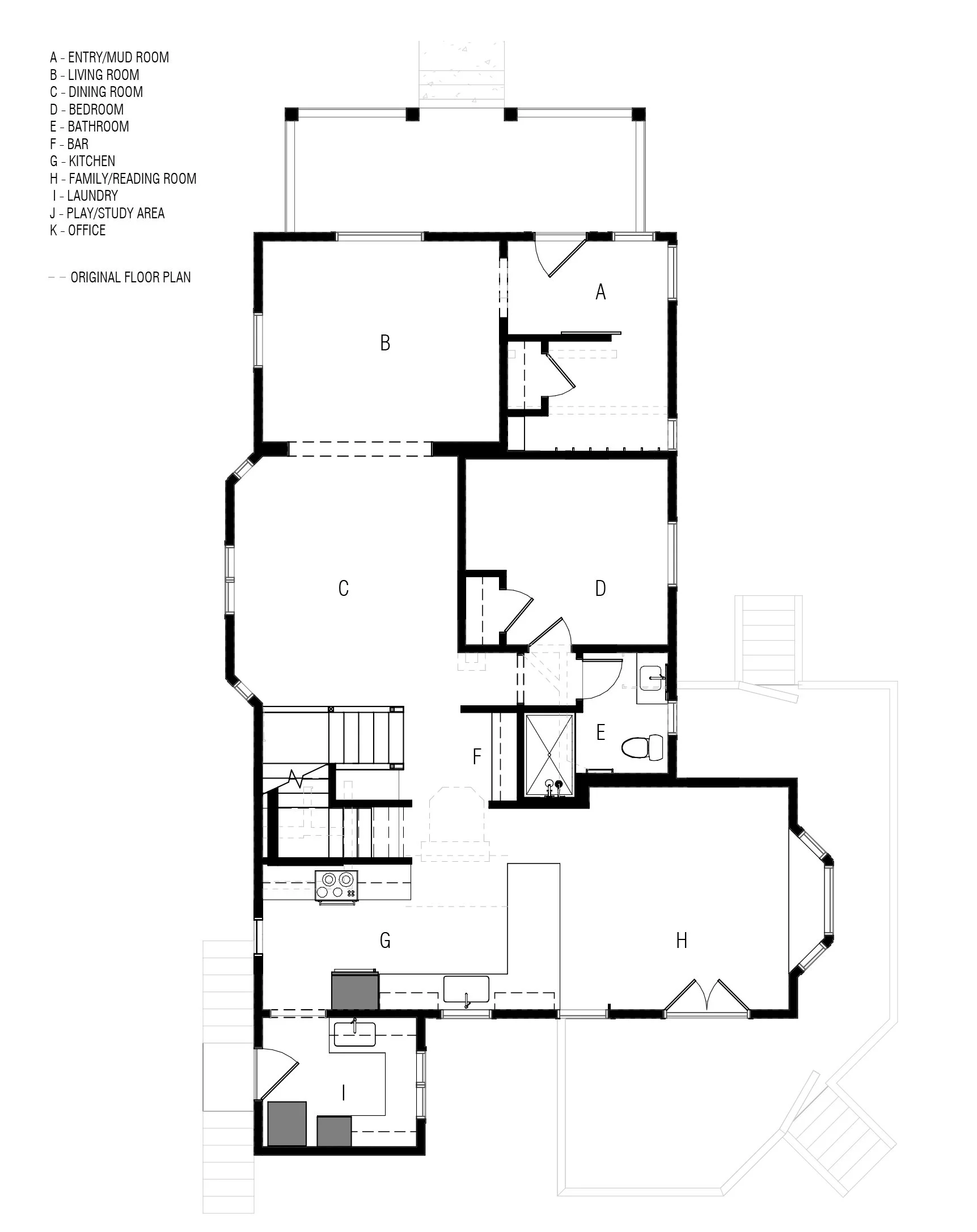 The owners of this 1911 home wanted to simplify the floor plan and update the interior finishes, making it more up-to-date and efficient for their family of 5. The century-old home had been tinkered with by previous owners, and at one point was two separate apartments. After decades of miscellaneous small renovations, the home was ripe for a refresh that would make it feel cohesive, cozy, and functional. The kitchen has been replaced with bright and clean finishes, paired with green metal open shelving throughout. An adjacent dry bar provides additional space for drink supplies and bonus kitchen storage. By removing a secondary stair and replacing it with a storage/ mudroom, we were able to increase storage opportunities while also consolidating circulation. A new grand staircase is adjacent to the dining room, allowing more light to enter the space while creating an improved connection to the bedrooms and bathrooms at level 2.