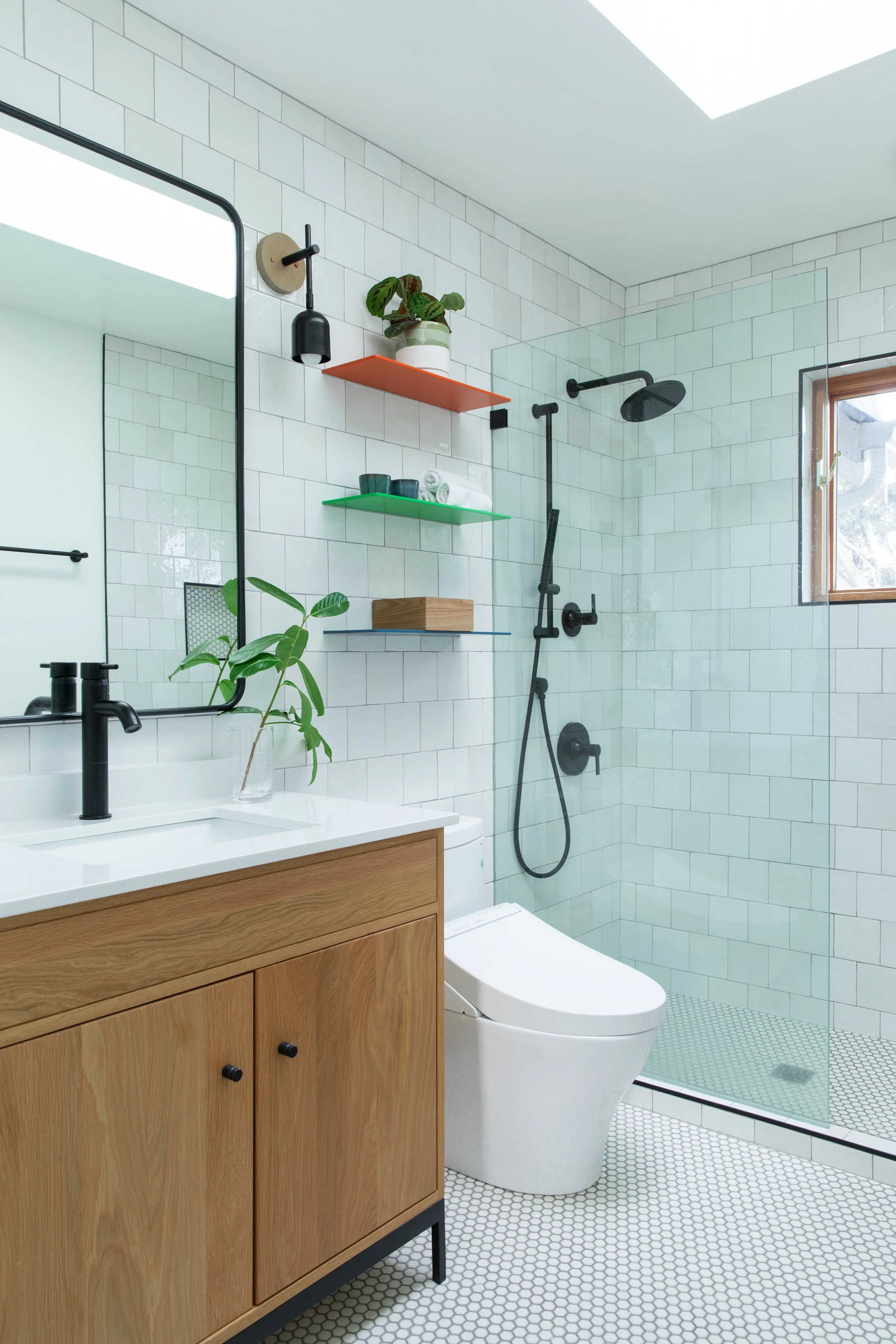 OOA’s goal with the interior finishes was to keep things simple and bright: finding a wood floor with lots of movement paired with bright white walls throughout. In an effort to introduce color, we asked each family member to pick a shelf and hook color for the mud room storage space, allowing each person to have a dedicated storage area. These colors continued through to the secondary bathroom, where each teen has their own shelf in their designated color. We loved utilizing this simple strategy to inject color and easy customization into this fun project!